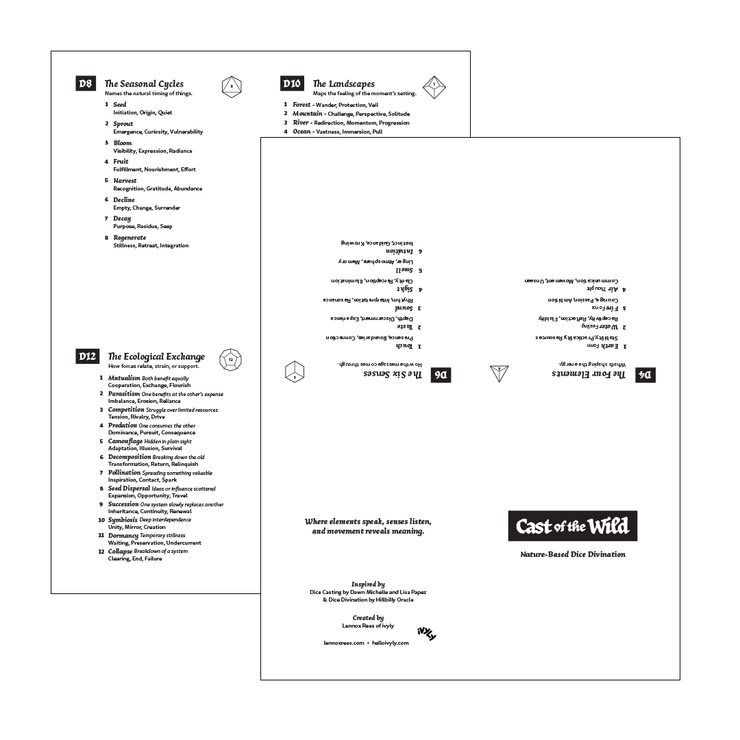 Cast of the Wild is a grounded, nature-based divination system using a polyhedral dice set (D4–D20).