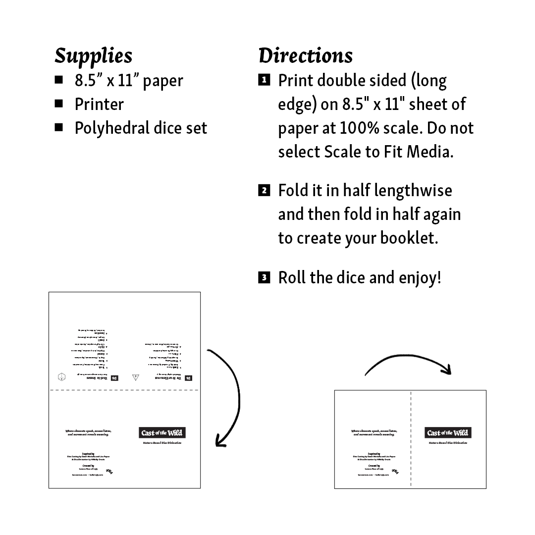 Print on 8.5" x 11" sheet of paper at 100% scale (do not "Scale to Fit Media") double sided (Long Edge). Fold it in half lengthwise and then fold in half again to create your booklet.