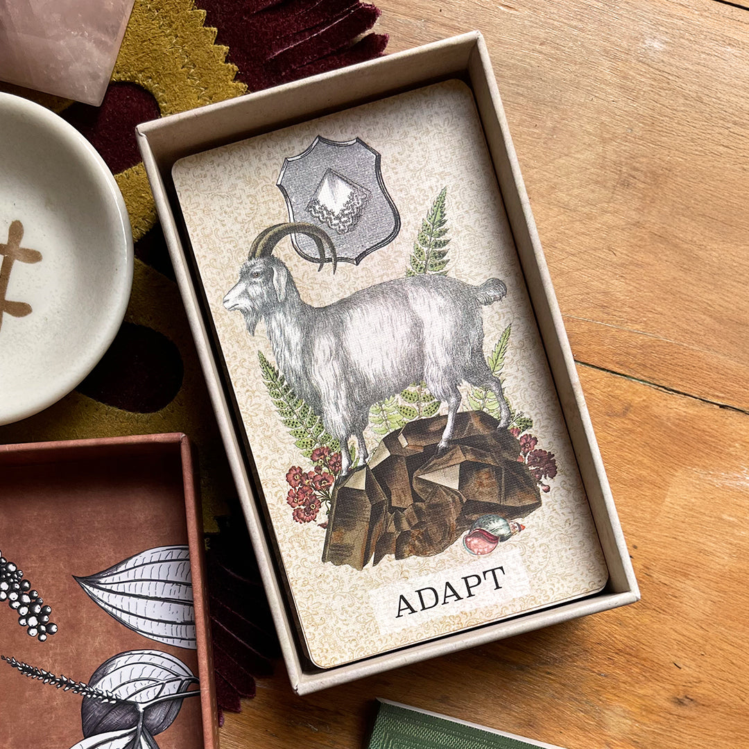 Wander through the 54 linen cards filled with cozy worlds of unusual keepsakes inspired by the rainy woodland coast of the Pacific Northwest. Discover flora and fauna and reflect upon messages in the 144-page guidebook. Guide your intuition for creativity and self-development. Unlock possibilities from the deep ocean to the dense forest.
