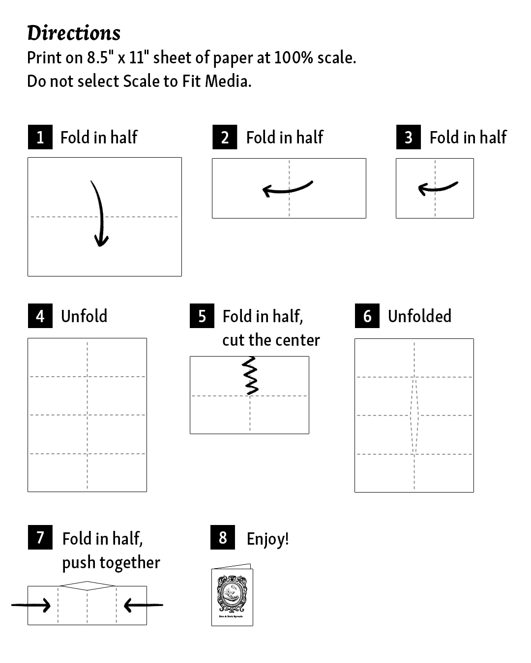 Print on 8.5" x 11" sheet of paper at 100% scale (do not "Scale to Fit Media"). Follow the folding instructions in the last photo, or search online "how to fold a zine."